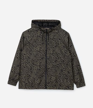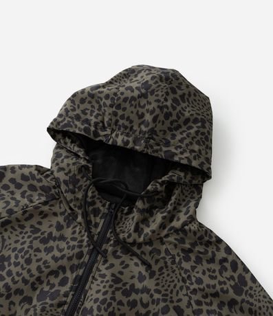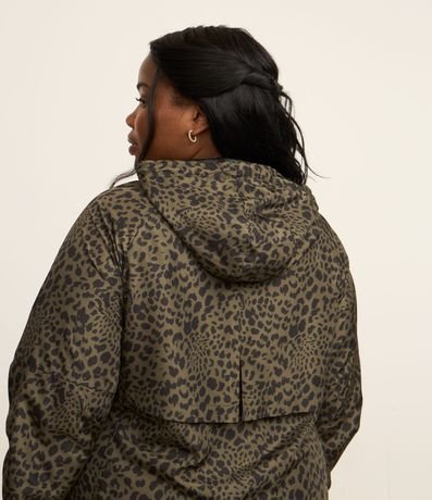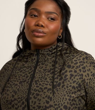 Ref: Jaqueta feminina esportiva Curve & Plus Size, confeccionada em tecnologia dry, com capuz, cordinha na gola, fechamento por zíper. Peça no modelo quebra vento, com manga longa, e estampa animal print.