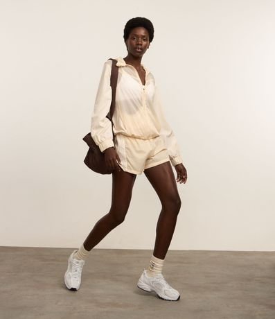 Ref: Jaqueta esportiva feminina, de modelo quebra-vento, confeccionada em poliamida, com gola alta e punhos ajustados. Sem estampa, possui fechamento frontal com zíper e recortes com fio refletivo.