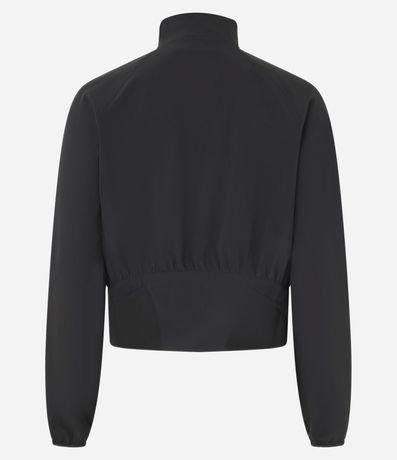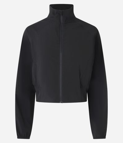 Jaqueta esportiva modelo quebra vento. A peça é lisa e possui gola alta.