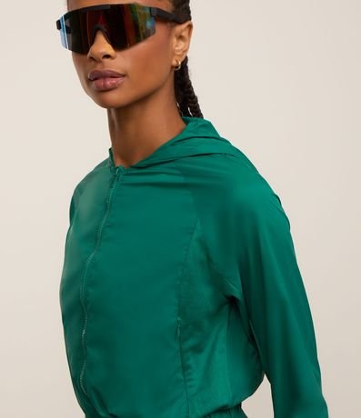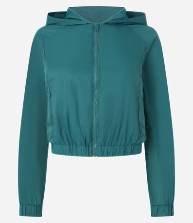 Jaqueta esportiva estilo corta vento cropped, com capuz, sem estampa. Possui saquinho para guardar.