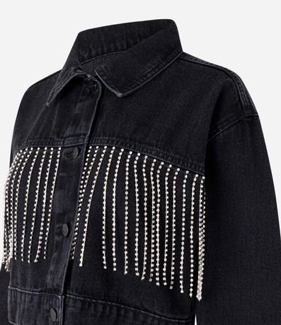 Ref: Jaqueta cropped confeccionado em algodão mais sustentável, fechamento por botões frontais e detalhe em franjas de strass.