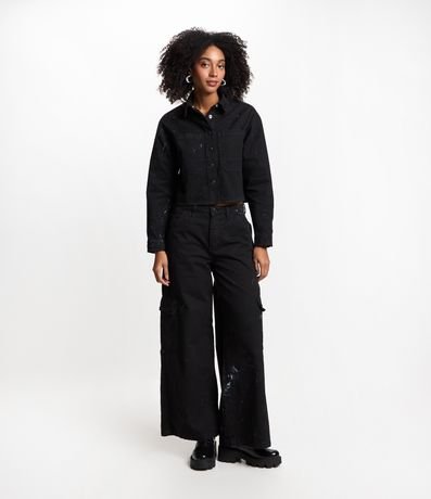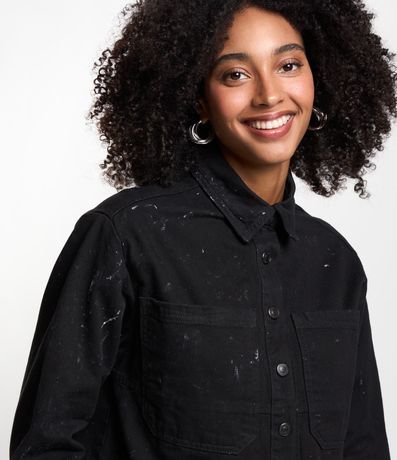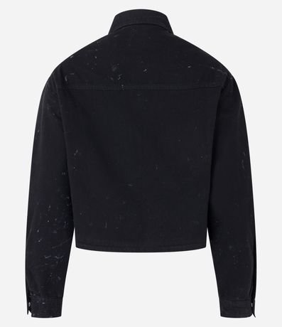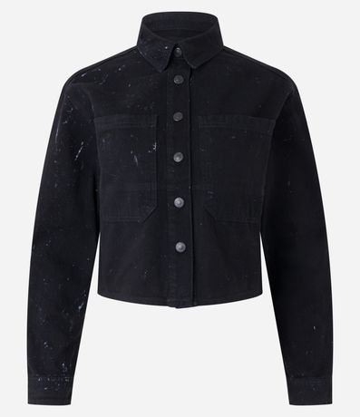 Ref: Jaqueat cropped confeccionada em sarja com colarinho na gola além de botões frontais para fechamento e mangas longas. Possui manchinhas de efeito estopado.
