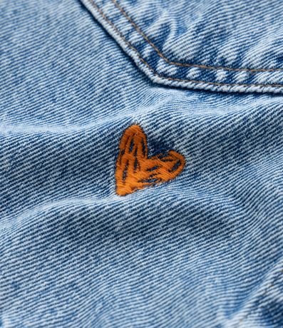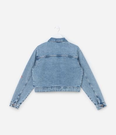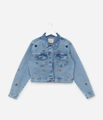 Ref: Jaqueta infantil confeccionada em jeans, de material mais sustentável e modelo curtinha. Possui gola colarinho, mangas longas, bolsinhos e bordado de corações.