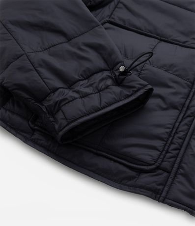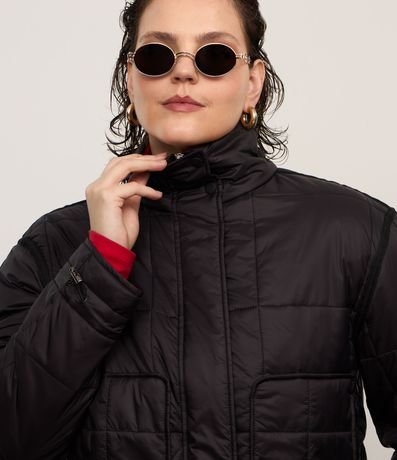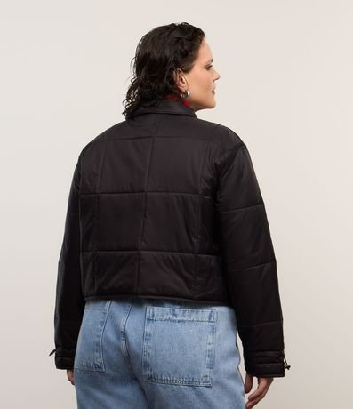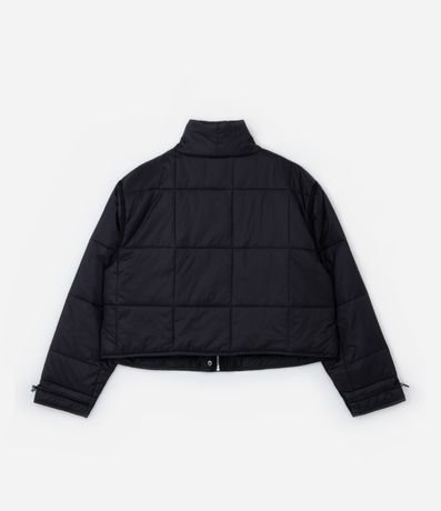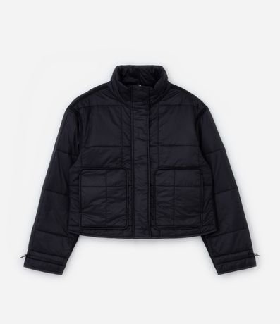Ref: Jaqueta de inverno acolchoada, modelo curto, com gola alta, bolsos quadrados frontais e ajuste nos punhos.