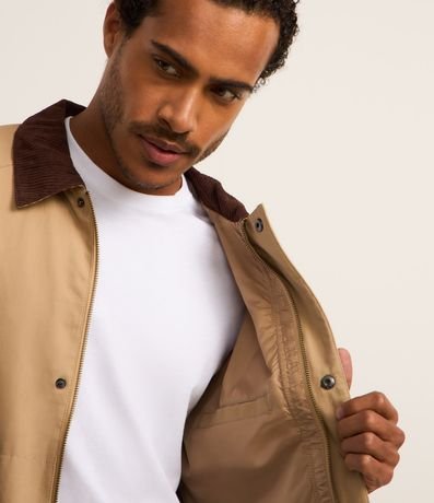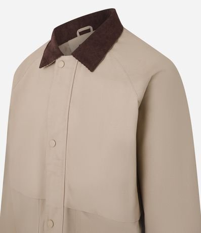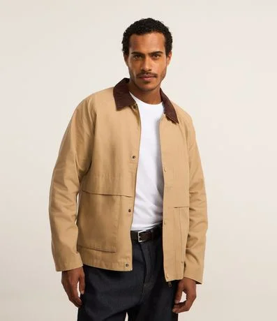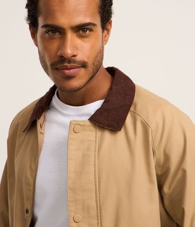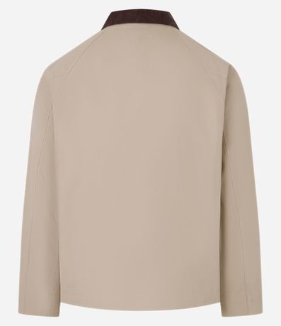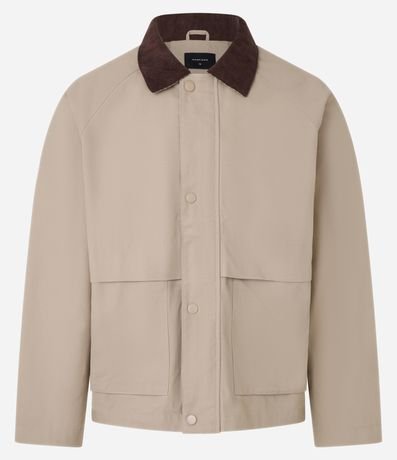 Ref: Jaqueta masculina confeccionada em algodão mais sustentável. A peça possui gola de veludo contrastante, bolsos grandes frontais, abotoamento discreto e mangas longas.