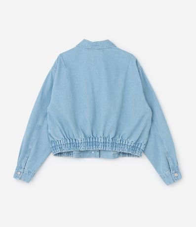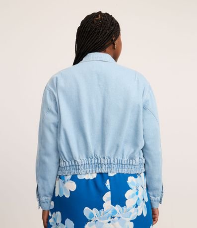 Ref: Jaqueta feminina Curve & Plus Size confeccionada em jeans de algodão certificado bci, com gola colarinho, abotoamento frontal, manga longa ajustada, com elástico na barra.