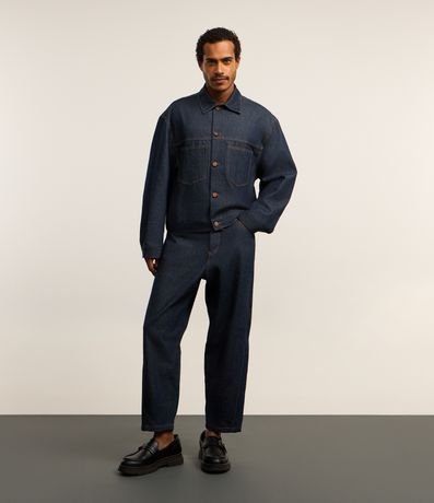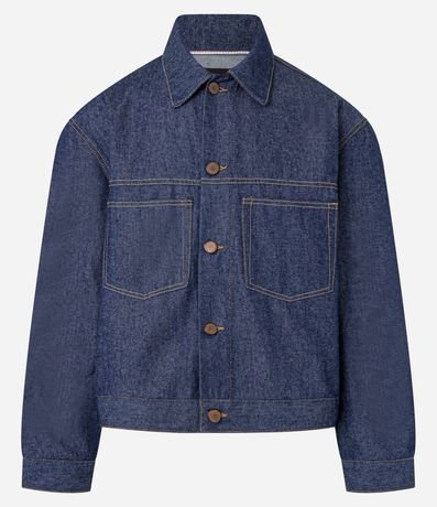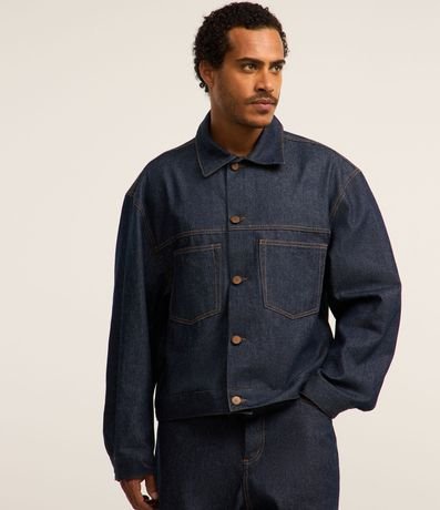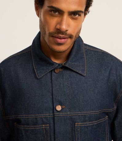 Jaqueta masculina confeccionada em jeans mais sustentável com boas práticas ambientais, possui gola colarinho, abotoamento, costuras contrastantes, bolsos frontais, cintura e punhos com botões.
