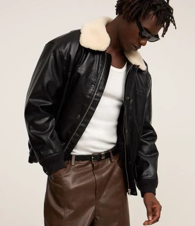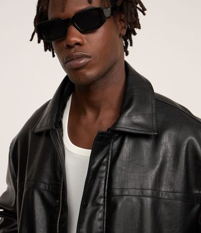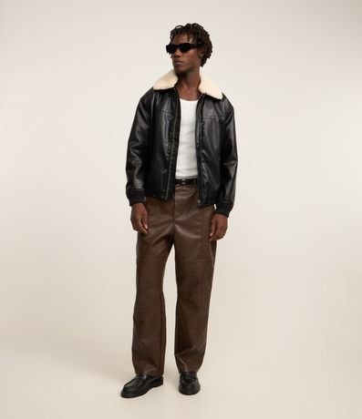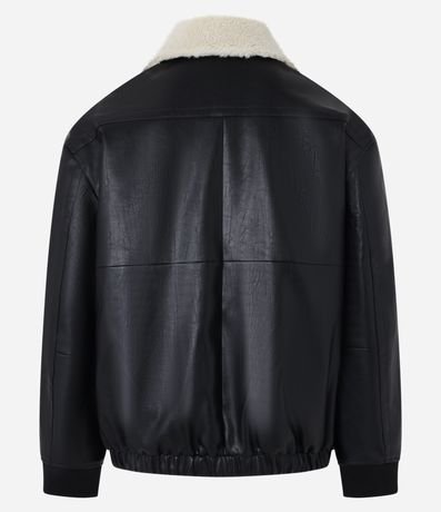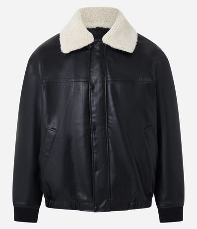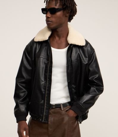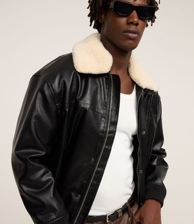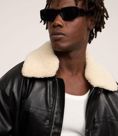Ref: Jaqueta masculina confeccionada em pu com gola em sherpa, abotoamento frontal, manga longa e bolsos laterais.