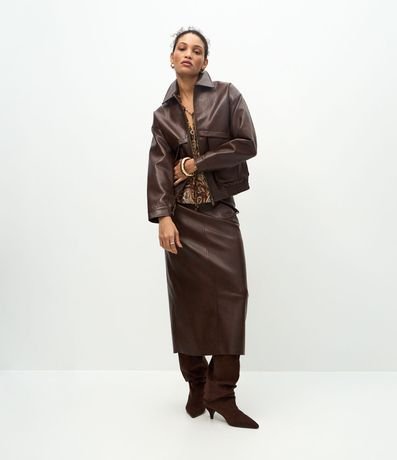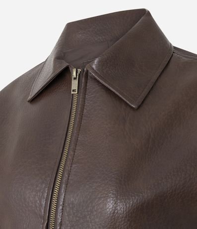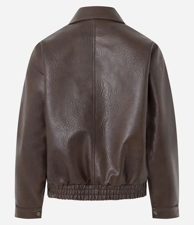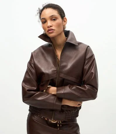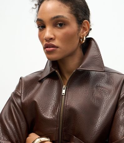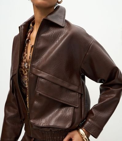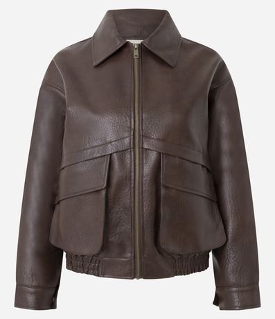 Ref: Jaqueta feminina em PU com modelagem reta e gola clássica. Possui recorte frontal estruturado e dois bolsos amplos tipo fole com tampas, zíper metálico frontal e barra com elástico discreto.