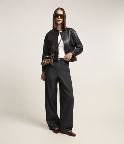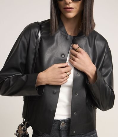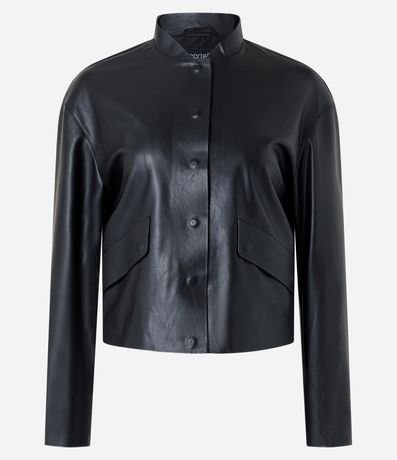 Jaqueta feminina, confeccionada em pu, com abotoamento frontal, mangas longas e bolsos lapela.