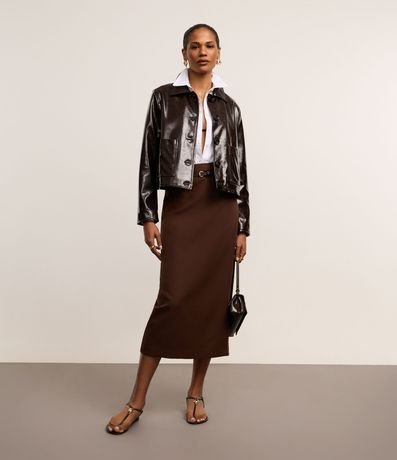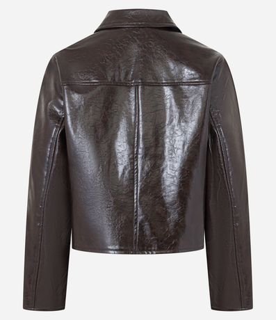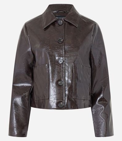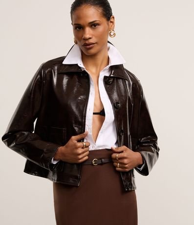 Ref: Jaqueta confeccionado em material sintético com colarinho na gola, botões frontais e bolsos frontais amplos. O casaco tem tecido com textura croco e efeito vinil, que confere um aspecto de verniz à peça.