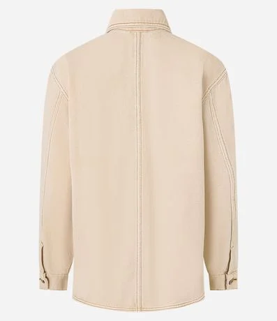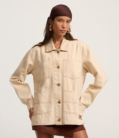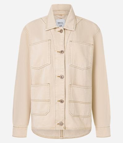 Jaqueta toda confeccionada em sarja de algodão certificado BCI produzido com baixo consumo de água, com colarinho na gola e botões frontais. Conta com 02 bolsos no peito e mais 02 bolsos próximos da barra, além de costuras aparentes.