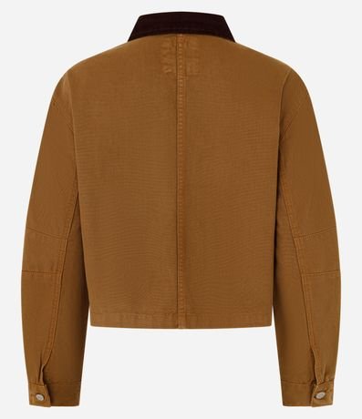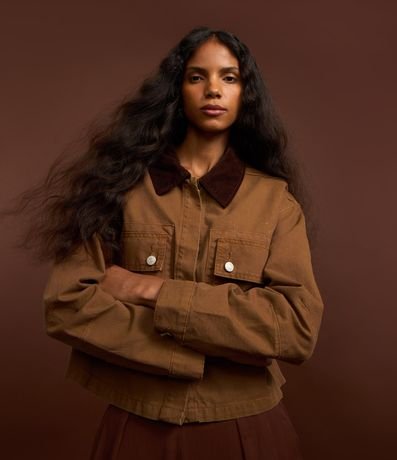 Ref: Jaqueta feminina confeccionada em sarja com gola de lapela contrastante e sem estampa. Possui algodão certificado BCI sustentável em sua composição, 02 bolsos frontais grandes e fechamento com vista oculta.