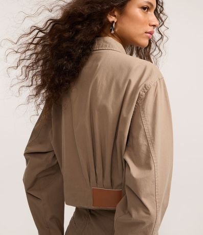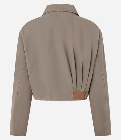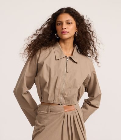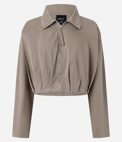 Ref: Jaqueta de sarja sem estampa com golinha polo, zíper frontal, pregas na barra e detalhe estilo etiqueta.