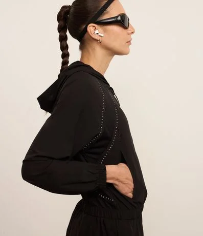 Jaqueta feminina esportiva cropped com detalhe refletivo. Peça com capuz e mangas longas.
