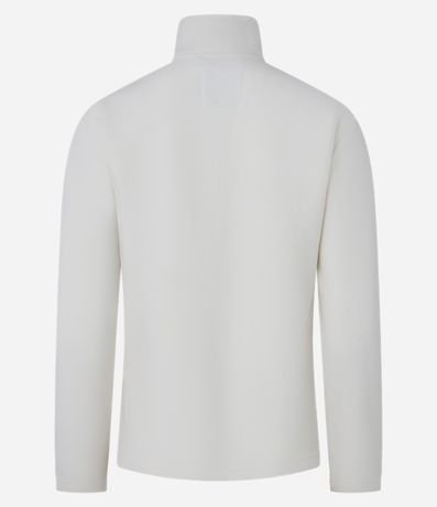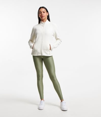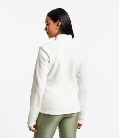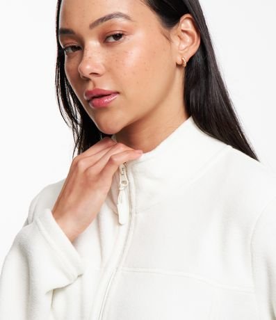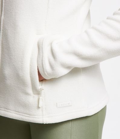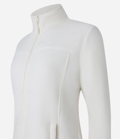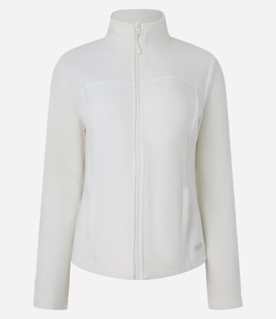 Jaqueta esportiva em fleece com gola alta e bolsos.