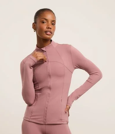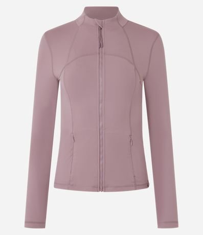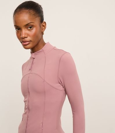 Jaqueta feminina esportiva, confeccionada e microfibra, com recortes e bolsos.
