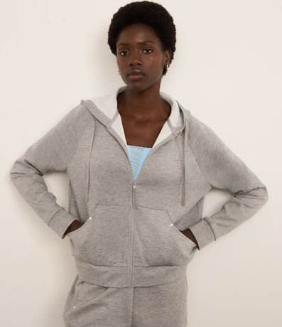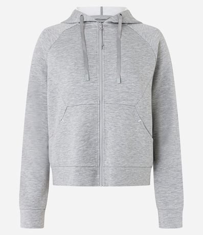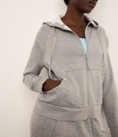 Ref: Jaqueta esportiva confeccionada em microfibra. A peça tem capuz com cordão, recortes frontais, zíper, bolsos e mangas longas.