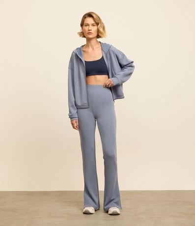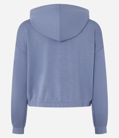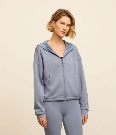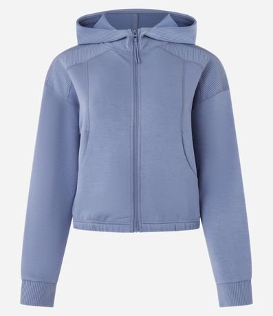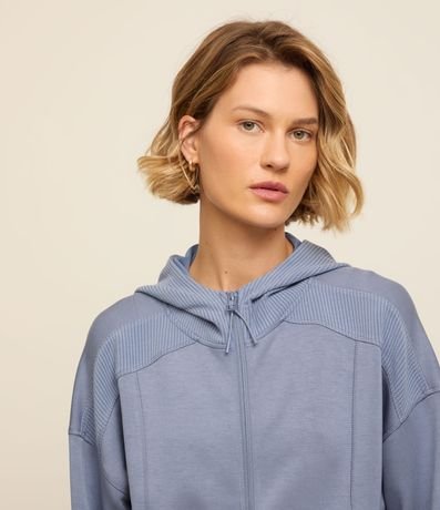 Casaco aberto esportivo confeccionado com modal. A jaqueta tem capuz, zíper frontal, bolsos e recortes texturizados nos ombros.