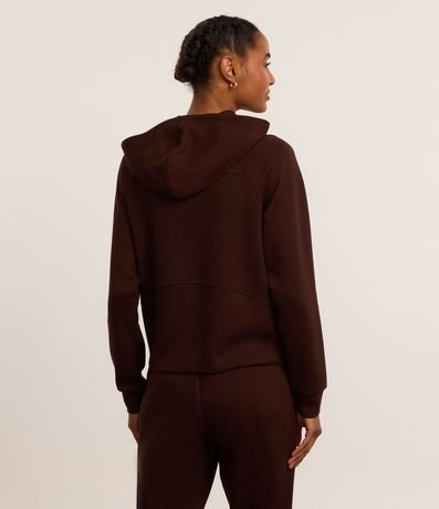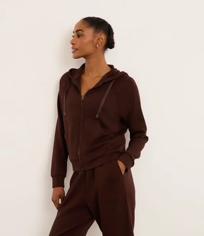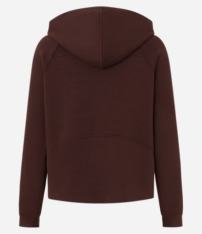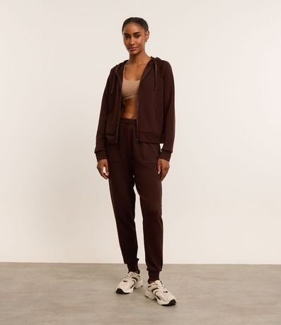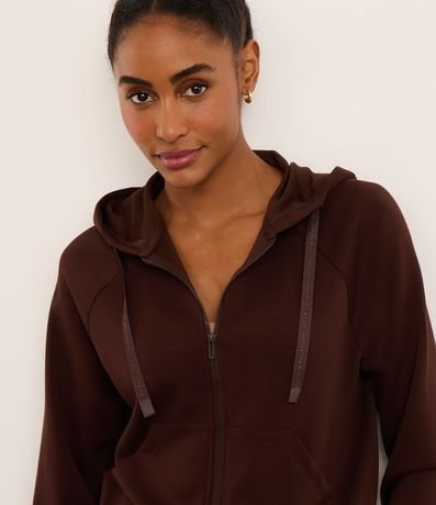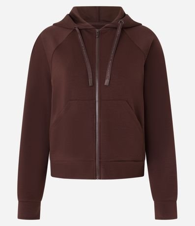 Jaqueta feminina esportiva em modal, capuz com cordão para ajustes, fechamento por zíper e bolsos.