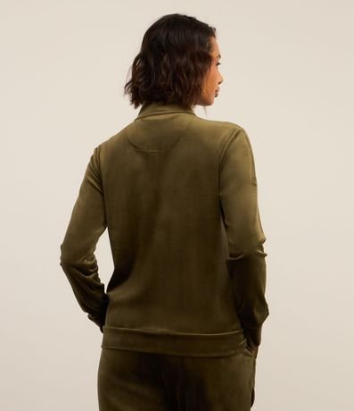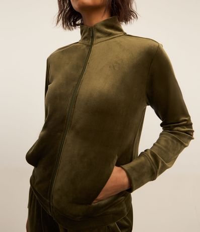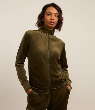 Jaqueta esportiva feminina confeccionada em plush, com gola alta e sem estampa. Possui bolsos e fechamento frontal com zíper.