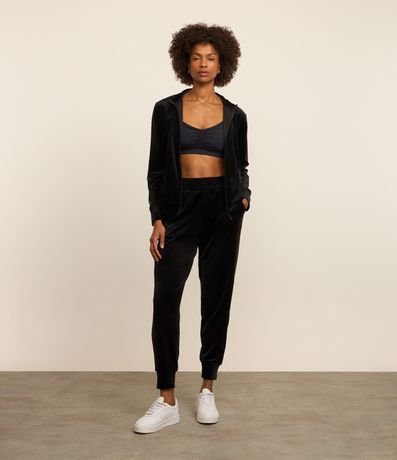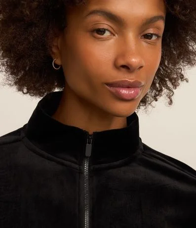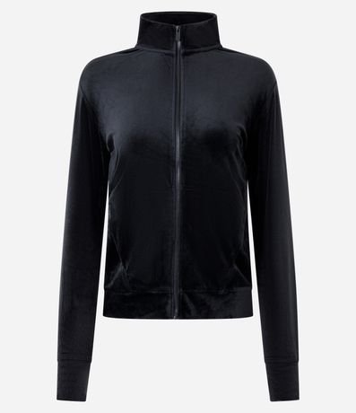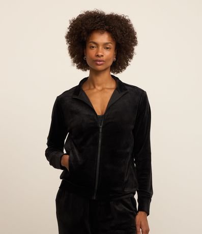 Ref: Jaqueta esportiva feminina confeccionada em plush, com gola alta e sem estampa. Possui bolsos e fechamento frontal com zíper.
