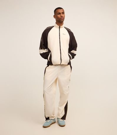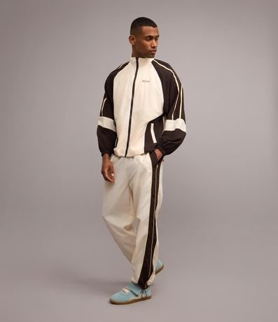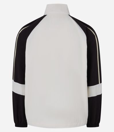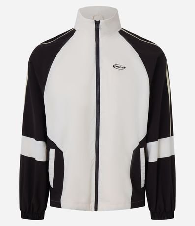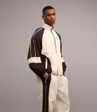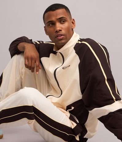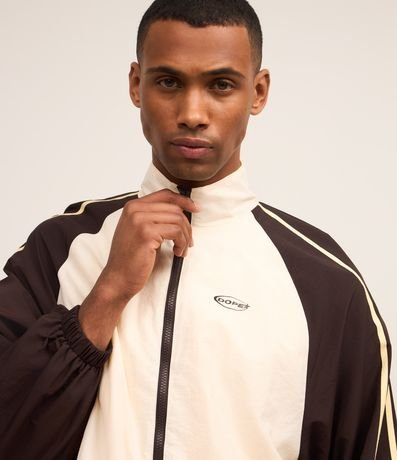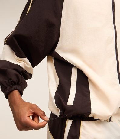 Ref: Jaqueta masculina esportiva em poliamida, com gola alta, fechamento por zíper, bolsos e estampa bloco de cores.