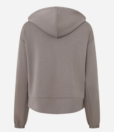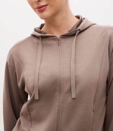 Ref: Jaqueta feminina esportiva confeccionada em modal, no modelo regular. Possui gola com capuz, cordão para amarração, manga longa, punhos ajustados, fechamento por zíper e bolsos.