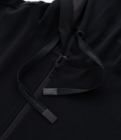 Jaqueta feminina esportiva confeccionada em modal, no modelo regular. Possui gola com capuz, cordão para amarração, manga longa, punhos ajustados, fechamento por zíper e bolsos.
