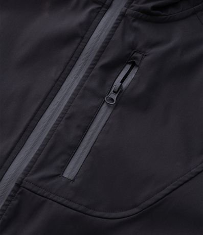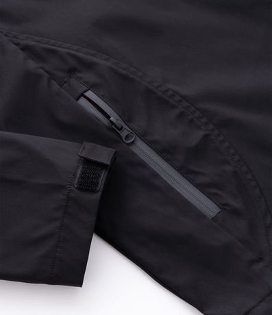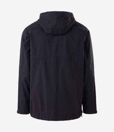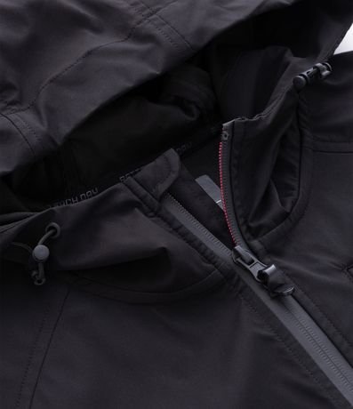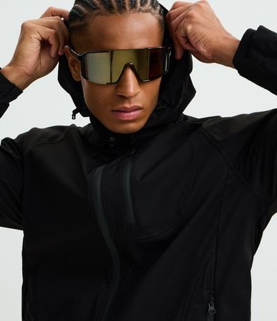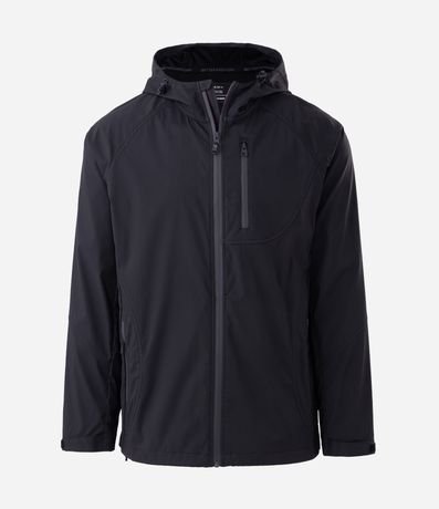 Jaqueta masculina leve com capuz ajustável e fechamento por zíper, desenvolvida em tecido tecnológico resistente à água. Possui bolsos com zíper para maior segurança e detalhe funcional no peito.