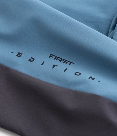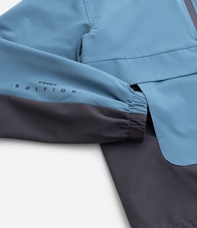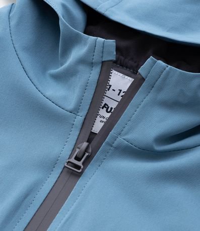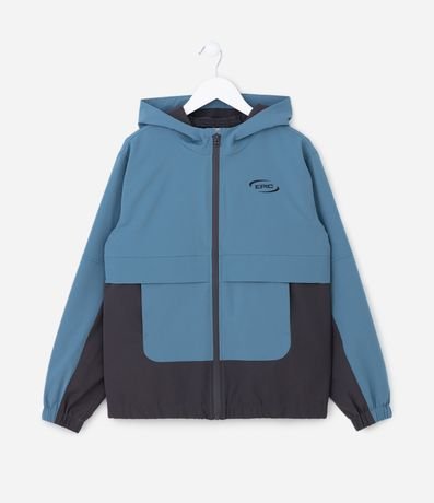 Jaquetinha infantil confeccionada em microfibra, com gola capuz, mangas longas com lettering. Peça bicolor e com fechamento por zíper.