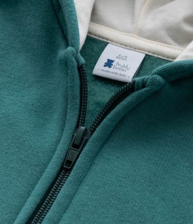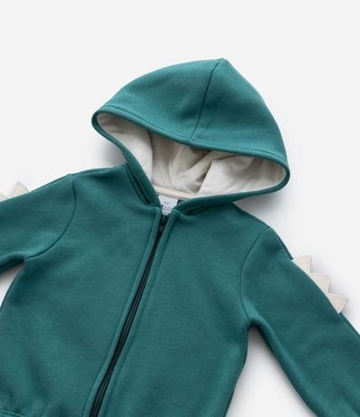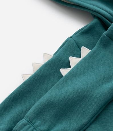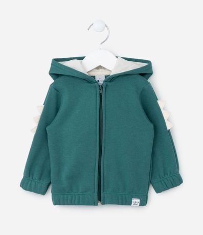 Ref: Jaqueta infantil confeccionada em moletom, com capuz na gola, mangas longas com punho ajustado, fechamento por zíper e detalhe de crista de dinossauro interativa.