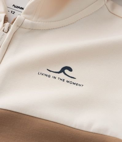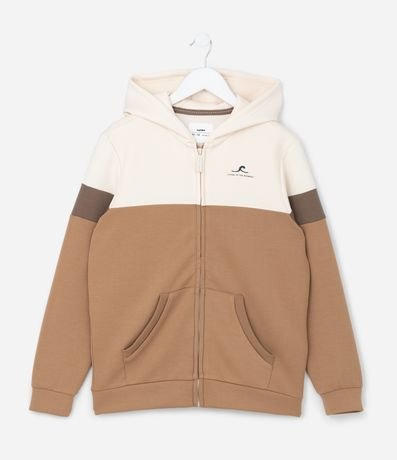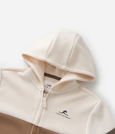 Jaqueta infantil confeccionada em techfleece, com capuz na gola, mangas longas, fechamento por zíper e bolsos frontais.
