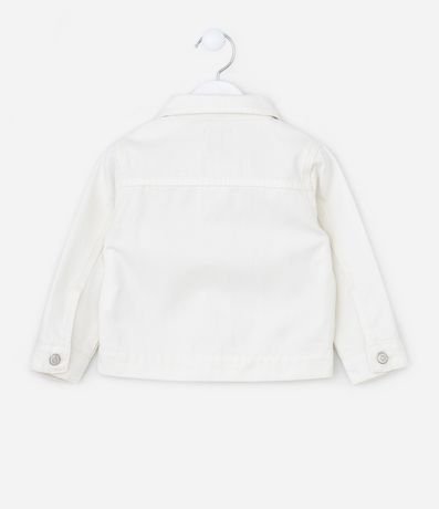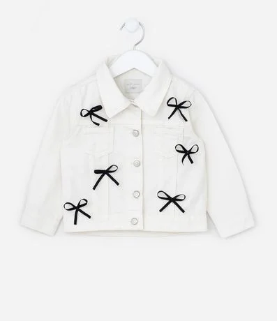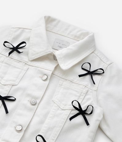 Ref: Jaqueta infantil em jeans, com gola colarinho, manga longa, fechamento por botões e detalhe de lacinhos contrastantes aplicados na frontal. A peça é confeccionada com boas práticas ambientais e algodão certificado bci.