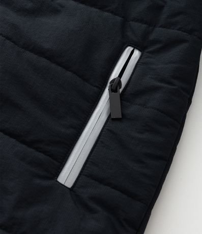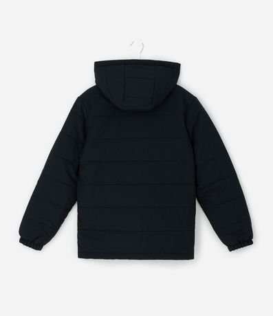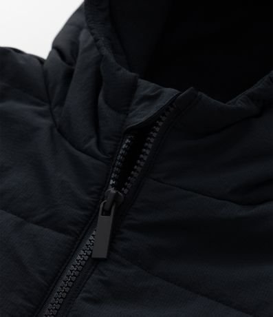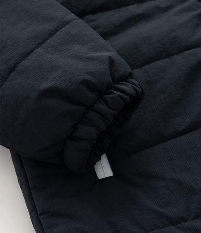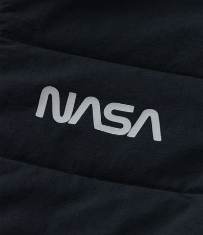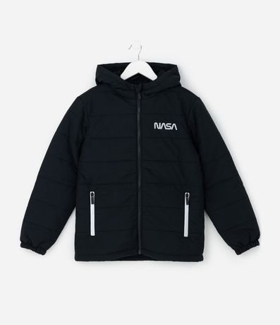 Jaqueta infantil intermediária confeccionada em tecido liso com estrutura acolchoada. Possui capuz fixo, mangas longas, fechamento frontal por zíper e bolsos funcionais. A estampa localizada com lettering da NASA faz referência à agência espacial conhecida mundialmente pela exploração do espaço, garantindo visual marcante e moderno para looks urbanos.