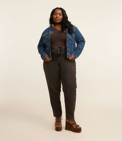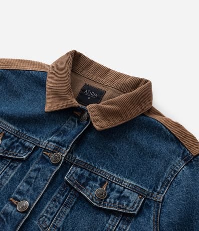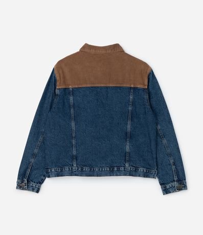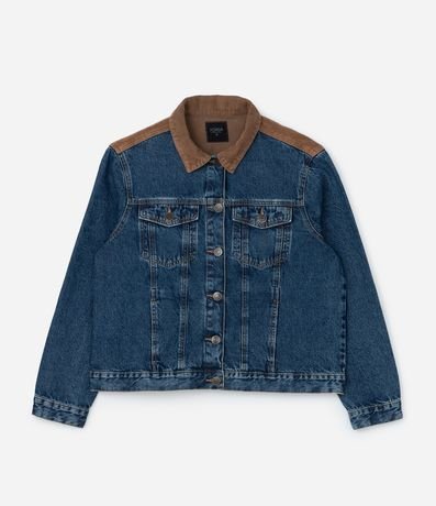 Ref: Jaqueta feminina Curve & Plus Size confeccionada com jeans mais sustentável em boas práticas ambientais, gola contrastante, detalhe nos ombros contrastante, bolsos com lapela, abotoamento frontal, manga longa e recortes frontais com desing de colete.