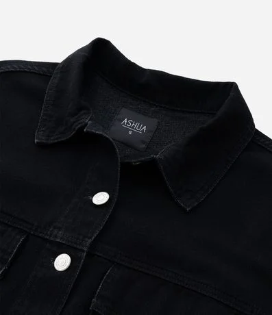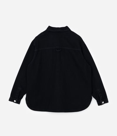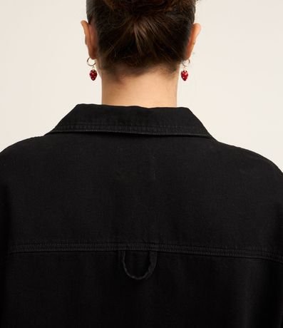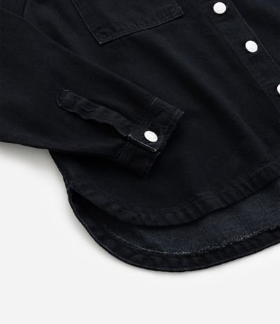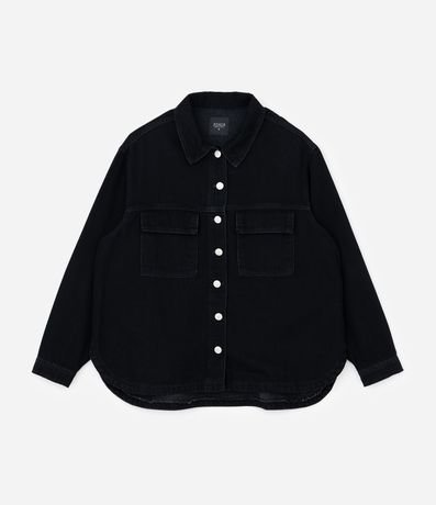 Ref: Jaqueta feminina Curve & Plus Size confeccionada em jeans mais sustentável com boas práticas ambientais, peça no modelo overshirt com gola colarinho, abotoamento frontal contrastante, bolsos cargo e manga longa.