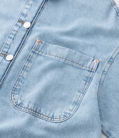 Jaqueta jeans modelo overshirt com golinha tradicional, mangas longas, abotoamento frontal e bolso no peito.