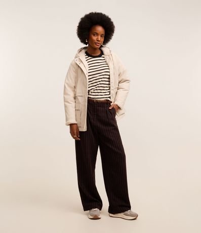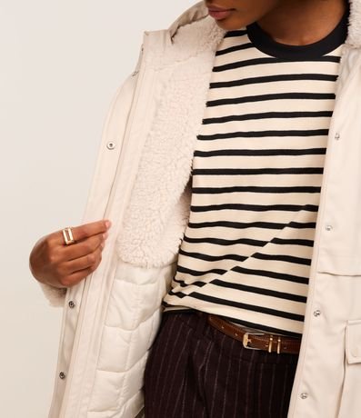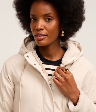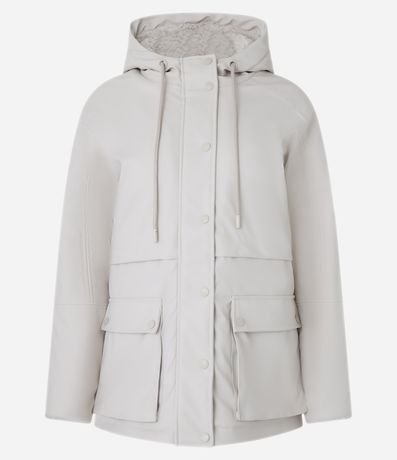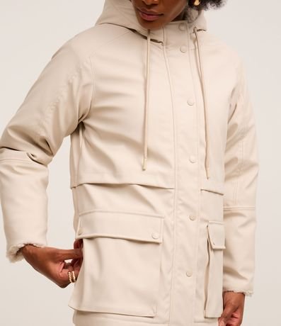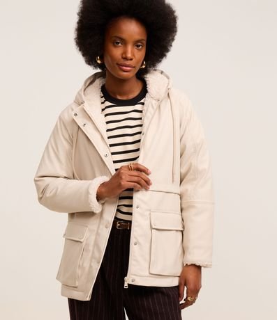 Jaqueta parka forrado com pelinhos artificiais, confeccionado em PU, com capuz e ajustadores na gola. O agasalho tem fechamento frontal e bolsos utilitários com lapelas que remetem a bolsos cargos.