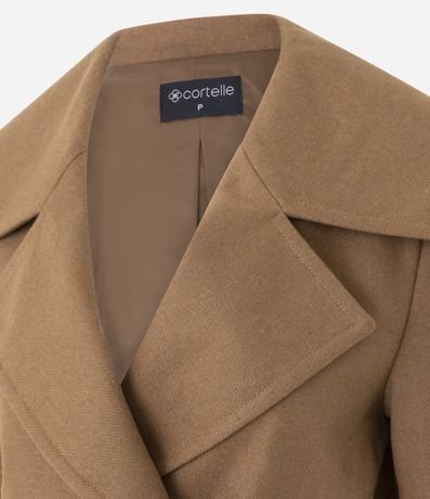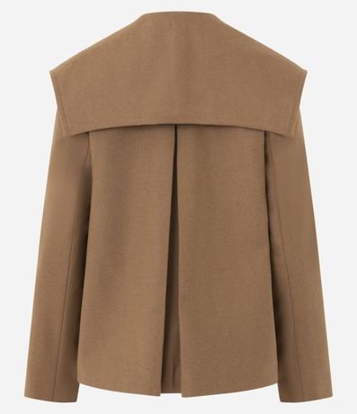 Ref: Jaqueta feminina pesada em poliéster com estrutura firme. Possui gola ampla com lapela alongada, fechamento transpassado por botões, mangas longas, bolsos frontais e detalhe de pala sobreposta nas costas com prega central.