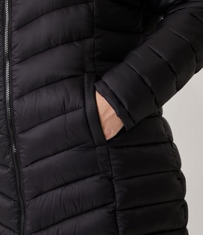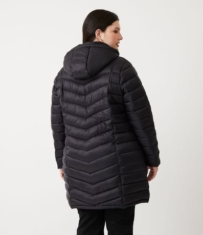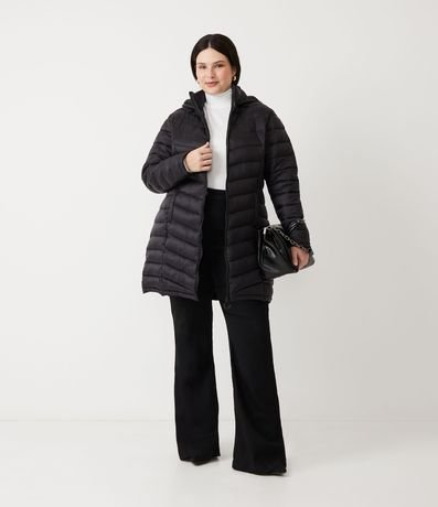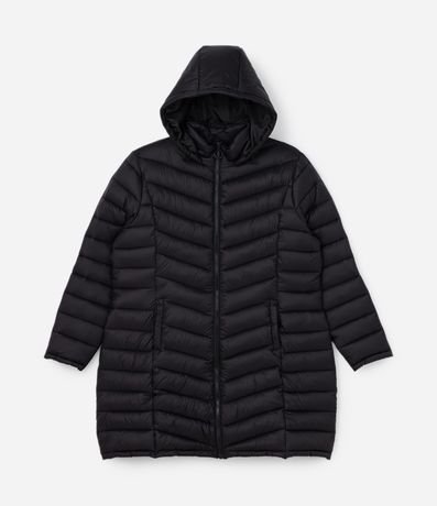 Jaqueta plus size de modleo puffer, alongada, confeccionada em poliamida, com gola alta e sem estampa. Possui bolsos, fechamento frontal por zíper e capuz.