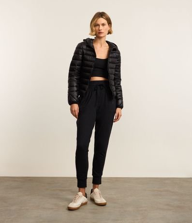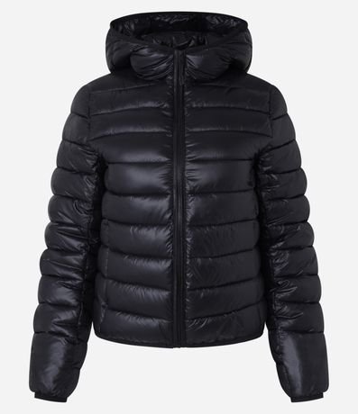 Ref: Jaqueta esportiva feminina, confeccionada em poliamida sem estampa. A peça conta com capuz, zíper frontal e gominhos que lhe dão um efeito puffer.