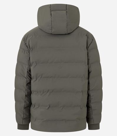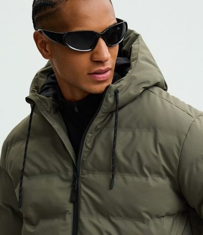 Jaqueta puffer masculina sem costura, confeccionada em poliéster leve com gola capuz ajustável por cordão e fechamento frontal por zíper. Modelo esportivo com mangas longas, punhos elásticos e design moderno para conforto térmico e estilo.