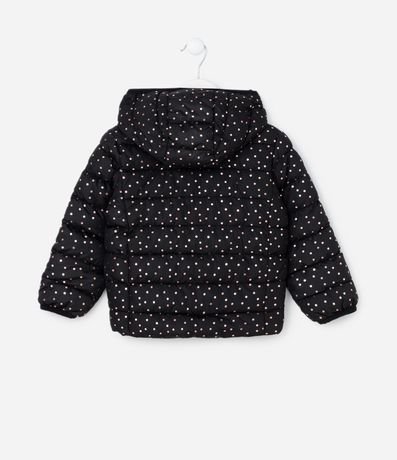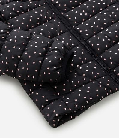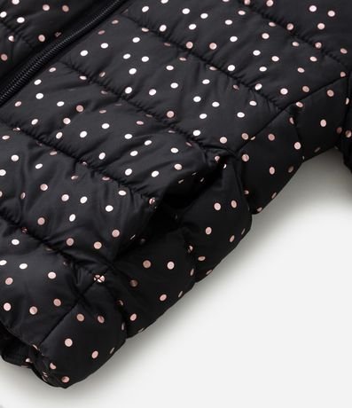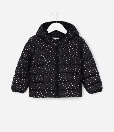 Ref: Jaqueta puffer infantil confeccionada em microfibra pesada com gola com capuz e fechamento frontal por zíper com coraçãozinho. Conta com estampa de poás - bolinhas - metalizadas.