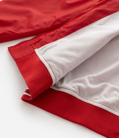 Ref: Jaqueta quebra vento infantil forrada com capuz, punhos ajustados, fechamento por zíper e etiqueta detalhada.