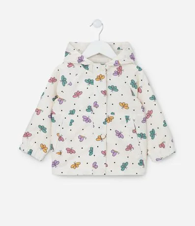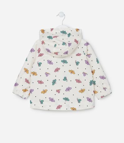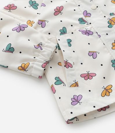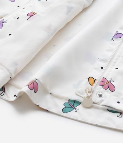 Jaqueta infantil de modelo corta-vento, confeccionada em microfibra, com capuz, mangas longas, bolsinho, fechamento por botões e zíper e estampa borboletinhas.