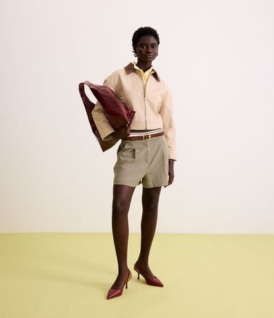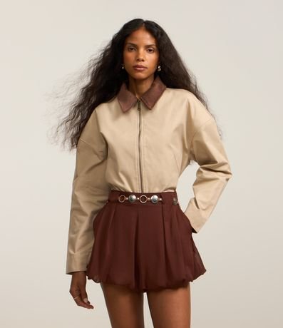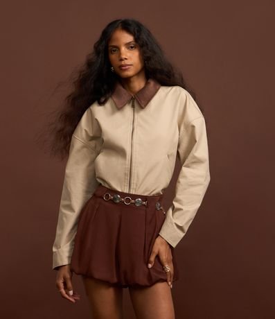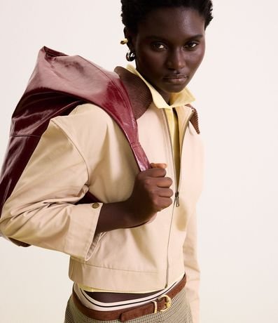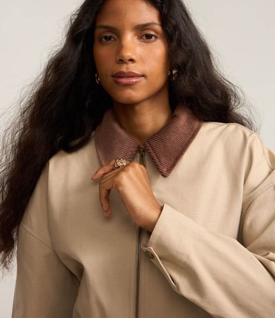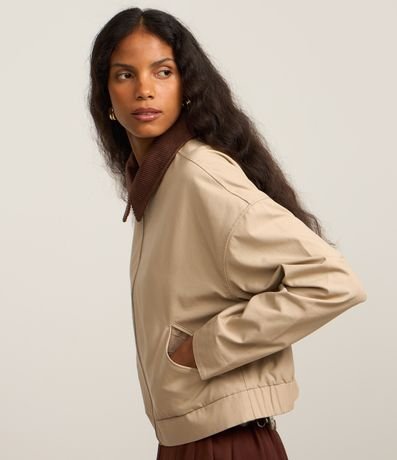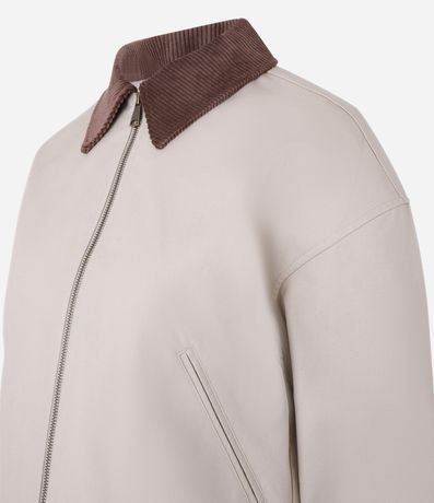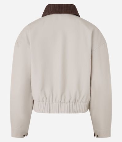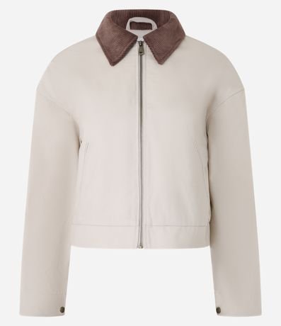 Ref: Jaqueta regular confeccionada em sarja, fechamento por zíper frontal e com golarinho contrastante.