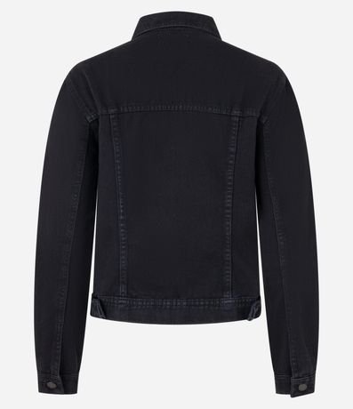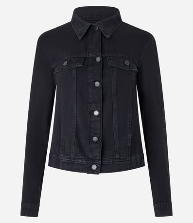 Ref: Jaqueta trucker confeccionada em sarja, básica com abotoamento frontal e bolsinhos fake com botões.