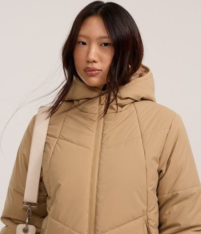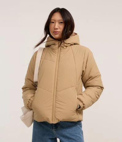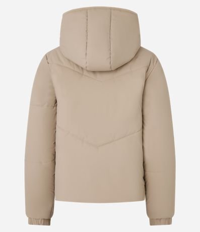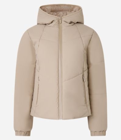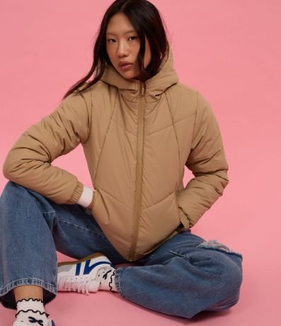 Jaqueta feminina quentinha, ultra leve, com gola alta e capuz. Sem estampa, possui bolsos laterais com fechamento por zíper e seu fechamento também por zíper na parte frontal.
