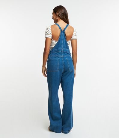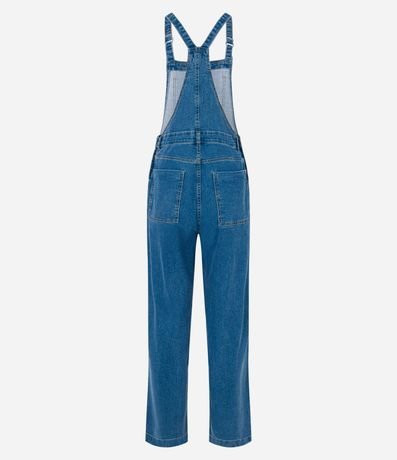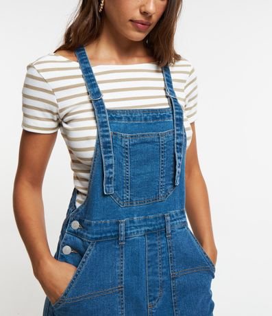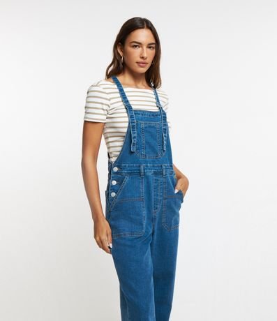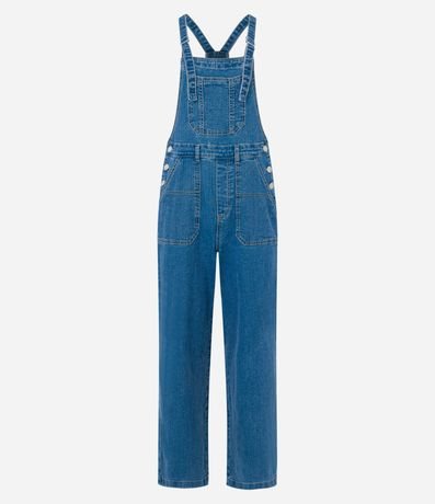 Ref: Jardineira em jeans, alças com fivela, bolso no peito, botões laterais e bolsos carpinteiro na parte da frente.